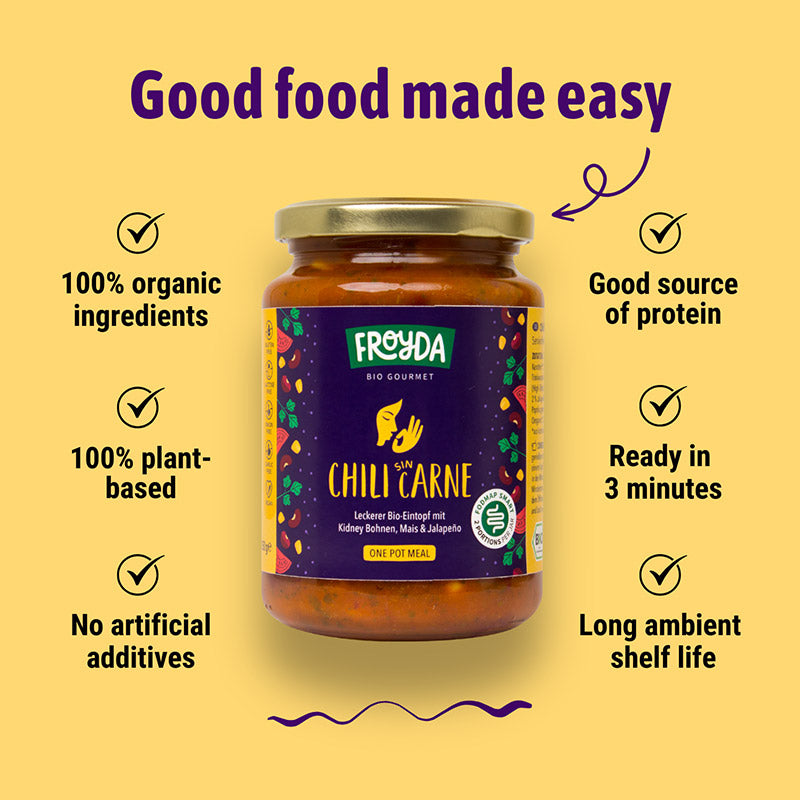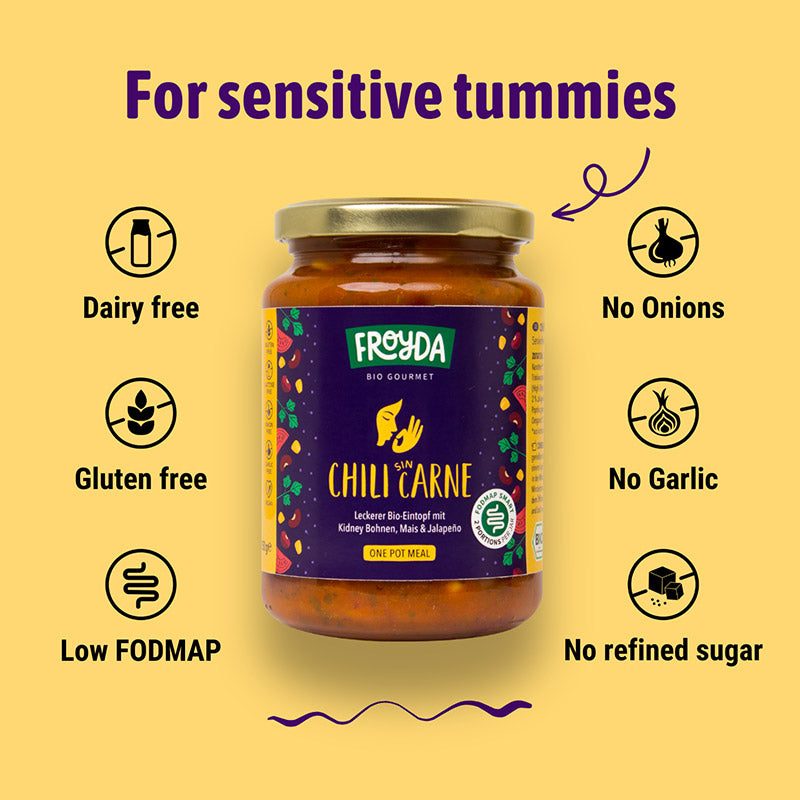 Froyda Chili Sin Carne is certified low FODMAP for half a jar serving (175g) by the Monash University.